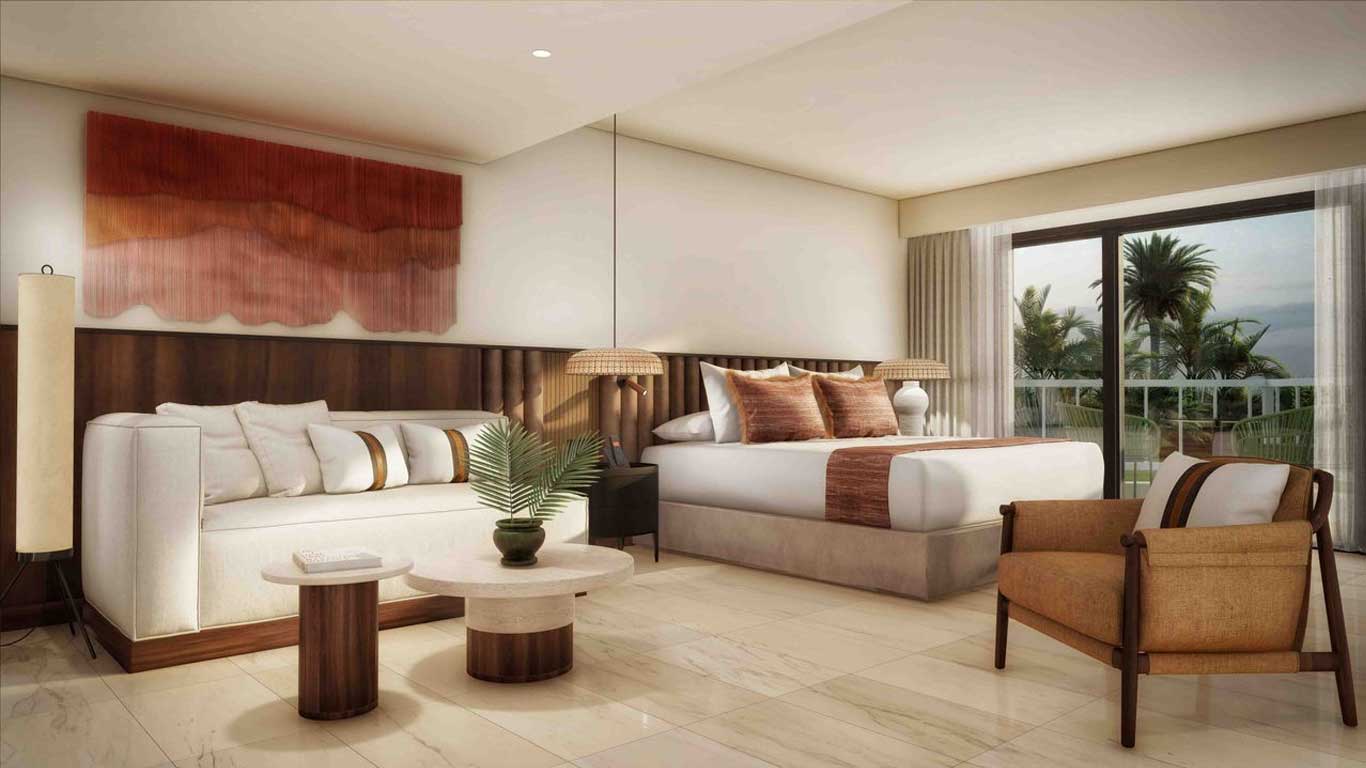Family Selection Junior Suite: Garden-view suite with whirlpool tub, shower, sofa bed, and terrace—perfect for comfort and relaxation after a fun-filled family day.It provides a whirlpool bathtub and shower, a sofa-bed and a lovely terrace on which to relax and enjoy the natural beauty. Featuring a king-size bed and a sofa-bed, this is the ideal room for travellers seeking comfort and memorable family experiences.